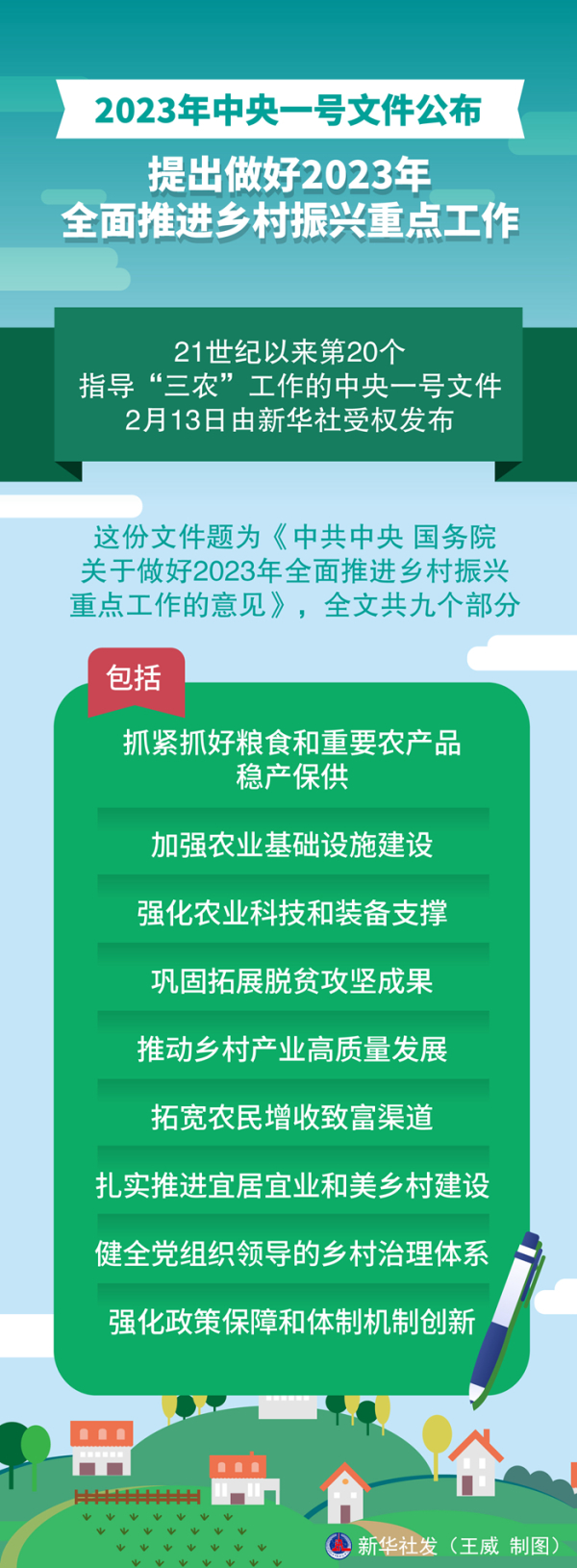 這份文件題為《中共中央 國務院關于做好2023年全面推進鄉村振興重點工作的意見》,全文共九個部分,包括:抓緊抓好糧食和重要農產品穩產保供、加強農業基礎設施建設、強化農業科技和裝備支撐、鞏固拓展脫貧攻堅成果、推動鄉村產業高質量發展、拓寬農民增收致富渠道、扎實推進宜居宜業和美鄉村建設、健全黨組織領導的鄉村治理體系、強化政策保障和體制機制創新。